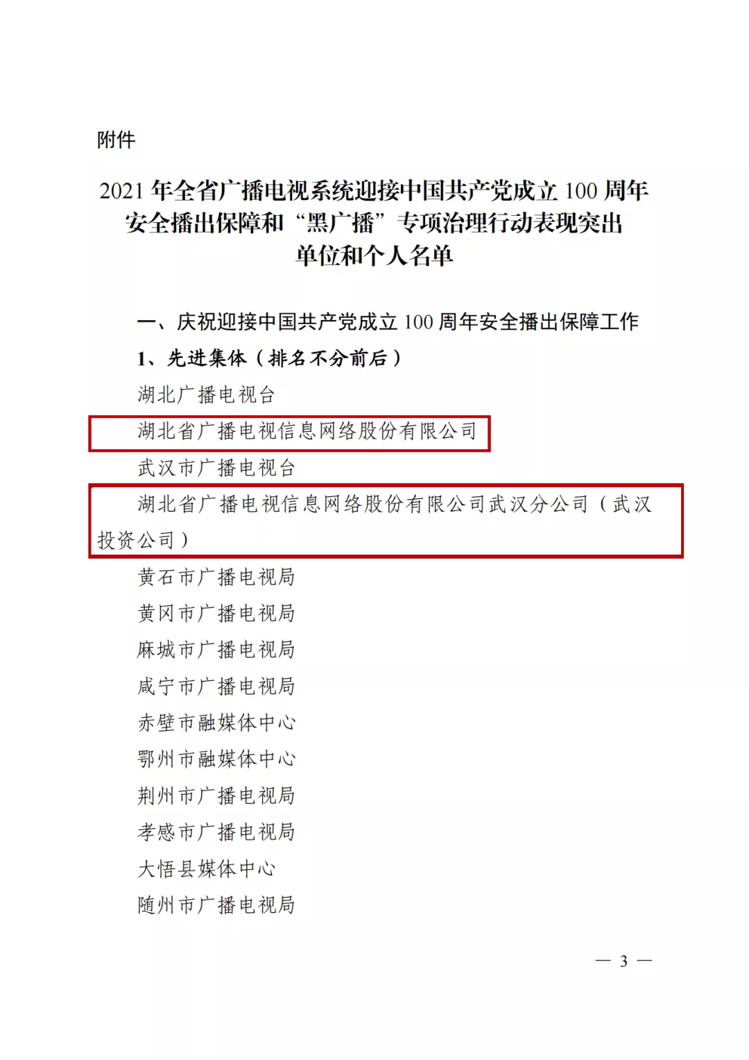 近日,省广电局下发《关于表扬2021年全省广播电视系统迎接中国共产党成立100周年安全播出保障和“黑广播”专项治理行动表现突出单位和个人的通知》,湖北广电网络公司多家单位和多名个人在维护我省广播电视设施安全、净化无线传输覆盖秩序方面成绩突出,受到通报表扬。