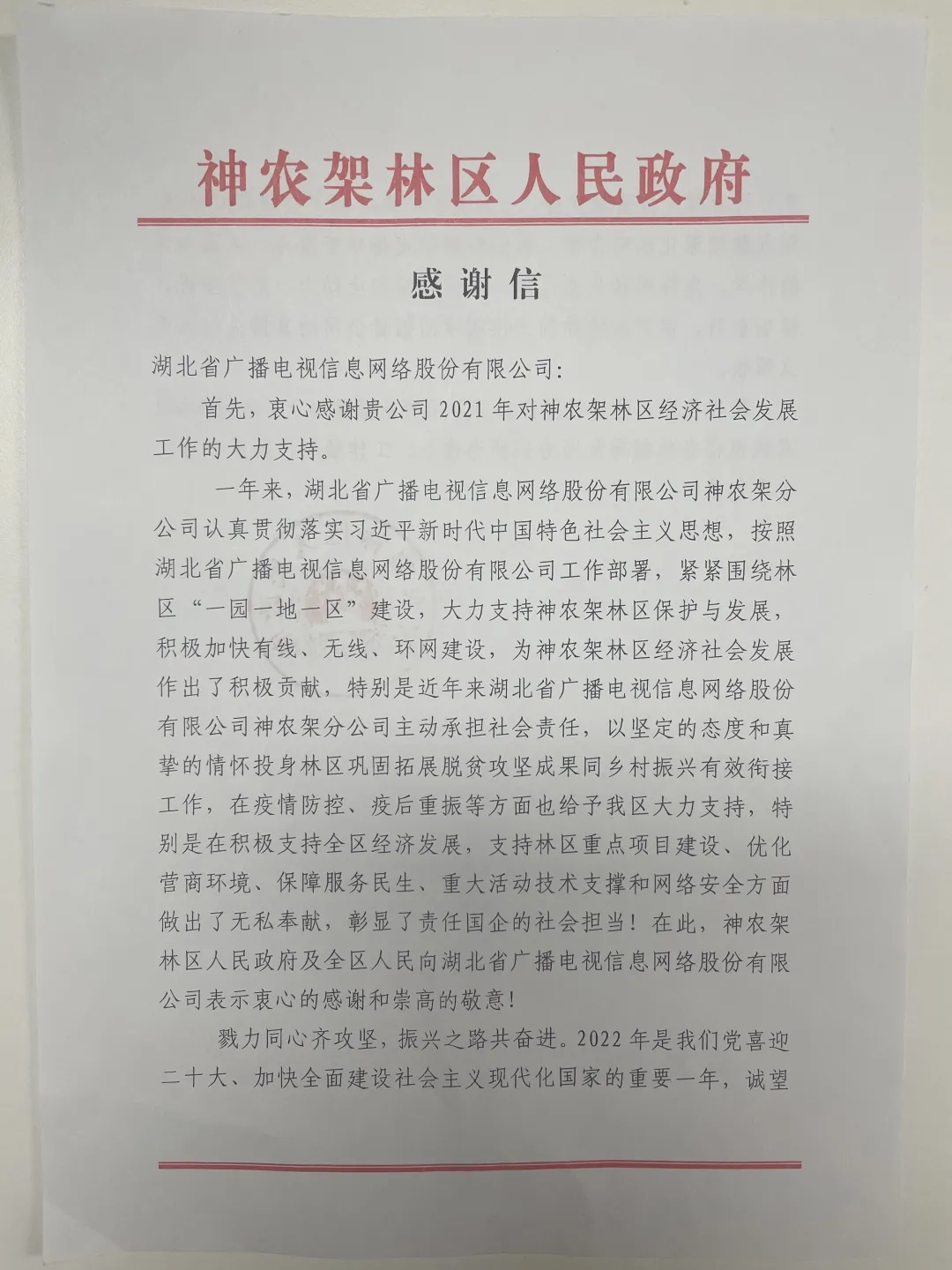 感谢信指出,湖北广电网络神农架分公司紧紧围绕林区“一园一地一区”建设,大力支持神农架林区保护与发展,积极加快有线、无线、环网建设,为林区经济社会发展作出了积极贡献,特别是近年来,神农架分公司主动承担社会责任,以坚定的态度和真挚的情怀投身林区巩固拓展脱贫攻坚成果同乡村振兴有效衔接工作,在疫情防控、疫后重振等方面给予林区大力支持,在积极支持全区经济发展,支持林区重点项目建设、优化营商环境、保障服务民生、重大活动技术支撑和网络安全方面做出了无私奉献,彰显了责任国企的社会担当。