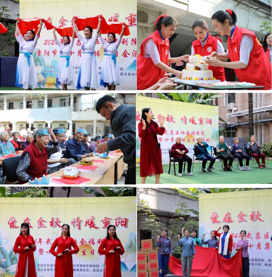 当日,武昌区福利院正举办重阳节暨十月长者生日会活动。活动现场,武昌区福利院精心为老人们准备了祝寿、文艺表演等节目以及互动小游戏,让老人们度过了一个祥和快乐的重阳节。